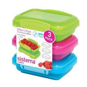 Oppdag den fargerike og praktiske Sistema-oppbevaringsboksen gjennom denne 3-pakningen med en kapasitet på 200 ml hver. Disse boksene kommer i tre farger - blå, grønn og rosa. Med Sistemas karakteristiske easy-close-funksjon kan du raskt og enkelt oppbevare snacks og småting. De er ideelle å ha med seg på farten, enten det er til barnas fruktpause eller til småsnacks på jobben.