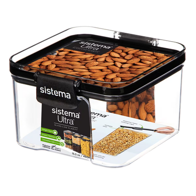 Sistema Tritan Ultra Square er en kompakt, firkantet oppbevaringsboks i krystallklar tritanplast med en kapasitet på 460 ml. Tritan-materialet gir en glasslignende klarhet samtidig som det er slitesterkt og uknuselig. Boksen er utstyrt med Sistemas patenterte låseklips og en lufttett forsegling som holder innholdet friskt lenger. Den elegante designen med svart og gjennomsiktig lokk gir rask oversikt over innholdet.