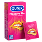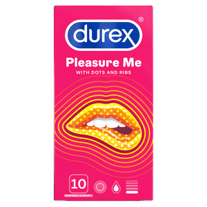 Disse Pleasure me-kondomene fra Durex er laget med riller og knopper for ekstra stimulering og nytelse for kvinnen under samleie. Durex Pleasure me-kondomene kommer i en pakke med 10 folieinnpakkede kondomer. Kondomene er laget av naturgummilateks og inneholder glidemiddel. Kondomene kan brukes til vaginal, anal og oralsex. Kondomene har en bredde på 56 mm.