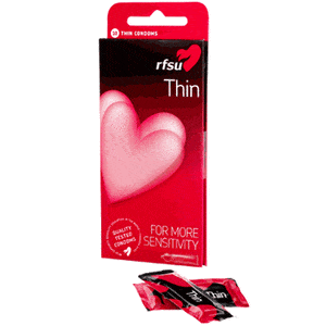RFSU Thin kondomer er ekstra tynne kondomer som gir en følelse av å ikke ha på kondom, men som samtidig gir like mye sikkerhet.