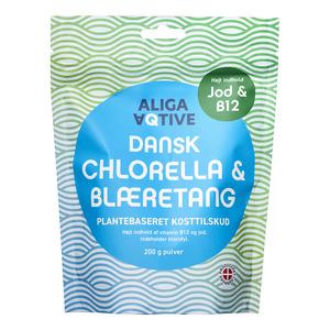 Aliga Aqtive er den eneste kosttilskuddsprodusenten i verden som kombinerer Chlorella og blæretang i ett og samme produkt. Chlorella er en alge som bidrar til å opprettholde normal tarmfunksjon, reduserer irritasjon i tarmveggen, støtter energinivået og øker veksten av gunstig mikroflora i tarmen. Chlorellas popularitet skyldes at den i tillegg til næringsinnholdet også bidrar til kroppens naturlige avgiftningsprosess. Hele 96 % av verdens chlorella produseres i Asia, men i dette kosttilskuddet brukes chlorella fra en dansk fabrikk i Nordjylland (Hjørring), der algene dyrkes i lukkede, sterile systemer.