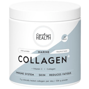 Marine Collagen+ fra Copenhagen Health er et prisbelønt 100 % hydrolysert marint kollagenpulver som har vist seg å redusere rynker og fine linjer. Den daglige dosen er +5000 mg kollagen og 80 mg vitamin C. Kollagenet er klinisk testet og dokumentert med aminosyrer av høyeste kvalitet. Med produktet oppnår du optimal absorpsjon av kollagenet ettersom det har en Da på 2000, som er det laveste på markedet. Pulveret har en nøytral smak og kan løses opp umiddelbart i vann, te eller kaffe, men du kan også strø det over yoghurten eller maten din.