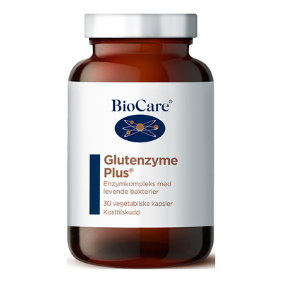 Glutenzyme Plus fra BioCare kombinerer vegetabilske fordøyelsesenzymer med levende melkesyrebakterier og er utviklet for inntak i forbindelse med glutenholdige måltider. Kapslene inneholder enzymer som cellulase, protease og amylase, i tillegg til laktobasiller – en type melkesyrebakterier. Disse ingrediensene bidrar til å bryte ned ulike komponenter i mat, inkludert glutenproteiner som finnes i hvete, bygg og rug. Tilskuddet er syrestabilt, noe som gjør at det bevarer sin funksjon gjennom hele fordøyelseskanalen. Egnet for både vegetarianere og veganere.