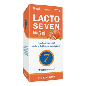 Lacto Seven Trio er en 3-i-1 tyggetablettløsning som kombinerer melkesyrebakterier med vitamin C og sink for å støtte immunforsvarets normale funksjon. Tyggetablettene inneholder 1 milliard melkesyrebakterier fordelt på syv ulike naturlige melkesyrebakteriestammer, inkludert Lactobacillus- og Bifidobacterium-arter. Melkesyrebakterienes effektivitet sikres gjennom Bio-support™-teknologien, som garanterer at de når tarmfloraen i live.