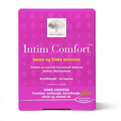 New Nordic Intim Comfort er et kosttilskudd for sunne slimhinner og urinveier. Kapslene inneholder tranebærekstrakt, nattlysolje, karvefrøolje og niacin, som er aktive ingredienser. Tranebær sørger for friske urinveier, niacin bidrar til sunne slimhinner, og nattlysoljen støtter produksjonen av prostagladiner som opprettholder balanse i hormonnivåene.