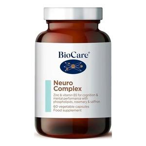 Neuro Complex fra BioCare er et kosttilskudd i kapselform, utviklet for voksne og basert på en kombinasjon av vitaminer, mineraler og planteekstrakter. Hver dagsdose (2 kapsler) inneholder blant annet salvie, rosmarin, safran, alfaliponsyre, karnitin, kolin og fosfatidylserin – i tillegg til sink og vitamin B5 (pantotensyre).