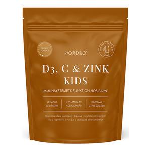 NORDBO D3, C & Zinc Kids er et vegansk kosttilskudd for barn som inneholder vitamin D3 fra soppalgen lav, vitamin C fra acerolabær samt prebiotisk kostfiber FOS (fruktooligosakkarider) og sink med høy biotilgjengelighet. Dette pulvertilskuddet for barn har en deilig bærsmak og er søtet med stevia.
