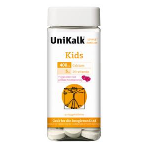 UniKalk Kids er et kosttilskudd i form av tyggetabletter med deilig jordbær/bringebærsmak, som inneholder kalk og D-vitamin. Tablettene anbefales til barn fra 3 år som ikke tåler melk eller av andre årsaker ikke får nok kalk og D-vitamin gjennom kosten. Kalk og D-vitamin er nødvendige for ditt barns normale vekst og knokleutvikling. D-vitamin er videre med å til vedlikeholde et normalfungerende immunsystem.