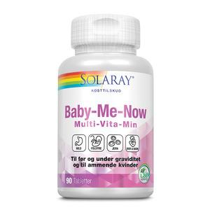 Solaray Baby-Me-Now er et multivitamintilskudd for kvinner før og under graviditet og amming. Tilskuddet er laget med en nøye utvalgt kombinasjon av vitaminer, mineraler og urter. Folsyre spiller en rolle i celledelingsprosessen, bidrar til å redusere tretthet og utmattelse og bidrar også til vevsvekst hos gravide kvinner. Jern spiller også en rolle i celledelingsprosessen. I tillegg inneholder kosttilskuddet kalsium, som bidrar til å opprettholde normale knokler og tenner og bidrar til normal muskelfunksjon, mens jern, vitamin B1, B2, B3, B5, B6, B12 og biotin alle bidrar til normal energiomsetning. Den tilsatte urteblandingen i Baby-Me-Now inneholder dessuten 1 mg tare, som er en naturlig kilde til jod.