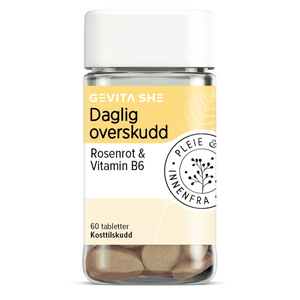 Gevita SHE Daglig overskudd er et kosttilskudd spesielt utviklet til kvinner i overgangsalderen som ønsker mer energi og overskudd i hverdagen. Kosttilskuddet inneholder blant annet rosenrot og vitamin B som bidrar til å redusere tretthet og utmattelse.