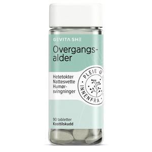 Gevita SHE Overgangsalder er et kosttilskudd egnet for kvinner som opplever plager i forbindelse med overgangsalderen som hetetokter, humørsvingninger og svette. Ingrediensen rødkløver inneholder isoflavoner som kan dempe de hormonelle symptomene. Tabletten er mandelformet og dermed enkel å svelge. Emballasjen er laget av gjenvunnede materialer. 100% vegansk kosttilskudd.