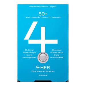 Kosttilskudd for kvinner over 50 år. 4HER 50+ er et kosttilskudd for de utfordringene mange modne kvinner opplever med slimhinner, muskelfunksjon, energi og immunforsvar. 4HER 50+ inneholder vitamin B7 (biotin), som bidrar til å opprettholde normale slimhinner, vitamin D, som bidrar til å opprettholde normal muskelfunksjon og immunforsvarsfunksjon, og biotin, som bidrar til normal energiomsetning.
