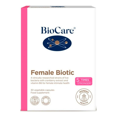 BioCare Female Biotic er et kosttilskudd i kapselform, utviklet for å støtte kvinnelig intimhelse. Produktet kombinerer 10 milliarder levende melkesyrebakterier fra fire klinisk undersøkte bakteriestammer med tranebærekstrakt og vitamin B6.