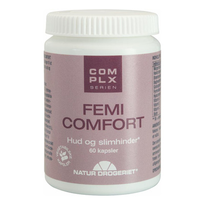 Natur-Drogeriet FemiComfort er et kosttilskudd for kvinner som ønsker støtte til hud og slimhinner. Det inneholder vitamin A og biotin, som bidrar til å opprettholde normal hud og slimhinner, og vitamin C, som bidrar til normal dannelse av kollagen, som er viktig for normal hudfunksjon. Tilskuddet er en del av Complx-serien og er utviklet og produsert i Danmark.