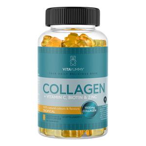 VitaYummy Collagen inneholder 1500 mg hydrolysert kollagen fra Verisol og vitamin C, som bidrar til normal dannelse av kollagen, som er viktig for normal funksjon av blodårer, skjelett, brusk, tannkjøtt, hud og tenner. De deilige gummiene inneholder også biotin, som bidrar til å opprettholde normal hud og normale slimhinner. Sink bidrar til å opprettholde normal hud og spiller en rolle i celledelingsprosessen.