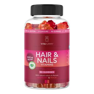 VitaYummy har kombinert de to populære smakene fersken og bringebær i en 90-pakning, slik at du enkelt kan velge hvilken smak du vil ha. VitaYummy Hair & Nails inneholder vitamin A, vitamin B, vitamin C, vitamin D, vitamin E og mineralene sink, selen og jod, som alle bidrar til å opprettholde og fremme normalt hår og normale negler. Dette kosttilskuddet er ideelt for deg som ønsker vakkert hår og sterkere negler.