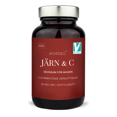 NORDBO Jern & C er et vegansk jerntilskudd med 20 mg jern og 100 mg vitamin C per dagsdose. Mange mennesker har nytte av et jerntilskudd, for eksempel gravide og blodgivere. Jern bidrar til dannelsen av røde blodlegemer, redusert tretthet og utmattelse og immunsystemets normale funksjon. Vitamin C er tilsatt for å optimalisere jernopptaket, da vitamin C øker opptaket av jern.