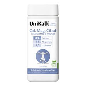 UniKalk Citrate med 200 mg kalsium, 58 mg magnesium og 2,5 µg vitamin D per tablett.