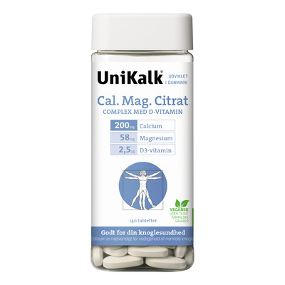 UniKalk Citrate er et kosttilskudd for deg som ønsker å supplere det daglige kostholdet med kalsium og samtidig få et tilskudd av vitamin D. En tablett inneholder 200 mg kalsium, 58 mg magnesium og 2,5 µg vitamin D, som bidrar til immunsystemets normale funksjon. Tablettene er dessuten lette å svelge sammen med noen av de daglige måltidene.