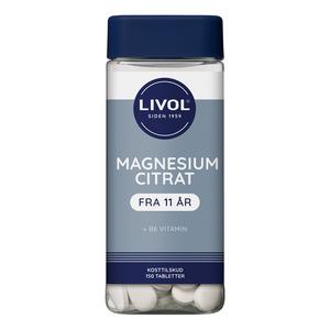 MagnesiumCitrat fra Livol er et kosttilskudd i tablettform som inneholder magnesium i citratform. Magnesium er et mineral som spiller en avgjørende rolle i flere av kroppens funksjoner - det bidrar blant annet til en normal muskelfunksjon samt vedlikehold av normale knokler og tenner. Tablettene inneholder dessuten vitamin B6 - i form av pyridoxinhydroklorid - som blant annet bidrar til immunsystemets normale funksjon.