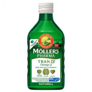 Tran fra torsk fanget i norsk arktisk farvann. Møllers Pharma Tran D+ sitron inneholder en unik kombinasjon av naturlig omega-3 fra fisk og vitaminene D, A og E. Dette er næringsstoffer som er viktige for optimal utvikling og bidrar til å holde deg frisk. En skje Møllers Pharma Tran gir deg 1,2 g naturlige omega-3 fettsyrer fra fisk og vitamin A, D og E. Fettsyrene EPA og DHA bidrar til hjertets normale funksjon. (Gunstig effekt oppnås ved et daglig inntak av 250 mg EPA og DHA). Vitamin D bidrar til immunsystemets normale funksjon. Vitamin A bidrar til å opprettholde normalt syn og til immunsystemets normale funksjon. Vitamin E bidrar til å beskytte cellene mot oksidativt stress. Møllers tran er spesielt rik på DHA som bidrar til å opprettholde en normal hjernefunksjon og et godt syn. Vitamin D er nødvendig for at barns bein skal vokse og utvikles normalt.