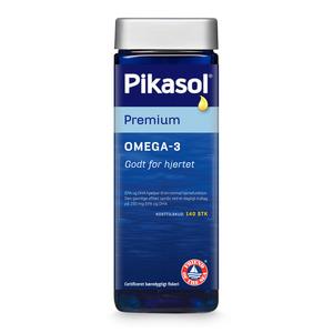 Pikasol Premium Omega-3 er et kosttilskudd med ren, høykonsentrert fiskeolje, som sikrer at din kropp får den anbefalte daglige tilførsel av omega-3 fettsyrer. Fiskeolje inneholder omega-3 fettsyrene EPA og DHA, som bidrar til en normal hjertefunksjon. Du oppnår denne gunstige effekten ved et daglig inntak på 250 mg DHA og EPA. Videre bidrar DHA til opprettholdelse av en normal hjernefunksjon samt et normalt syn ved daglig inntak på 250 mg DHA.