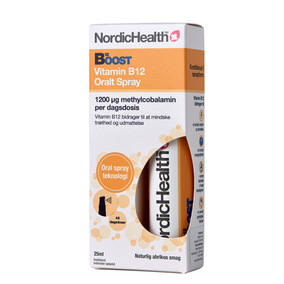 NordicHealth Boost B12 Vitamin Spray er en dokumentert effektiv B12-spray. Den har en herlig søt aprikossmak som er søtet med tannvennlig xylitol.