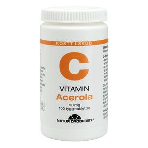 Dette naturlige vitamin-tilskuddet tilfører kroppen C-vitaminer på en deilig behagelig måte. Tyggetablettene inneholder den lille røde Acerola frukten som kan minne om kirsebær i smaken - derfor smaker tablettene godt og litt syrlig. Tablettene inneholder 90mg C-vitamin som bidrar med gunstige egenskaper til kroppen. Vitaminet finnes normalt i kosten da mennesker ikke kan produsere nutrienten selv. Hvis du ikke får nok gjennom kosten, kan du med fordel ta et tilskudd.