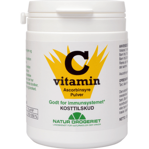 Natur-Drogeriet C-vitamin pulver inneholder ascorbinsyre, som blant annet bidrar til immunforsvarets normale funksjon