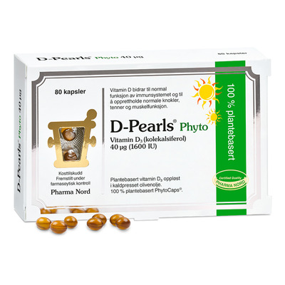 Pharma Nord D-Pearls Phyto er et plantebasert vitamin D-tilskudd laget av alger. Hver kapsel inneholder 38 μg vitamin D3, som er utvunnet og renset fra alger dyrket under kontrollerte forhold. D-vitaminet er oppløst i kaldpresset olivenolje, en metode som brukes for å fremme stabiliteten og opptaket av vitaminet. Kapslene er laget av fermentert mais, potet og erter og inneholder dermed ingen cellulose eller HPMC, noe som gjør dem egnet for både vegetarianere og veganere.