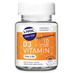 Livol Vitamin D3 10 µg tyggetablett er egnet for dem som har problemer med å svelge tabletter. Tabletten har en herlig appelsinsmak og passer for barn fra 3 år og voksne. D-vitamin bidrar til å opprettholde immunsystemets normale funksjon og bidrar også til å opprettholde normal skjelett-, tann- og muskelfunksjon. D-vitamin bidrar også til normal absorpsjon og utnyttelse av kalsium og fosfor.