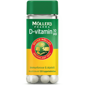 Møllers Pharma D-vitamin bidrar til immunforsvarets normale funksjon, til vedlikehold av tenner og skjelett, samt til normalt opptak av kalsium. Tyggetablettene har smak av appelsin. Inneholder ikke gluten, laktose eller gelatin. Boksen er laget av 98 % resirkulert plast, og er resirkulerbar. For voksne og barn fra 3 år.