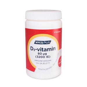 Nycoplus D-vitamin 80 mikrogram er et kosttilskudd som bidrar til immunforsvarets normale funksjon, vedlikehold av skjelett og tenner samt opptak og utnyttelse av kalsium i kroppen.
