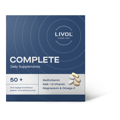 Livol Complete 50+ er et komplett kosttilskudd spesielt utviklet for voksne over 50 år. Hver eske inneholder 30 dagsposer, noe som gjør det enkelt og praktisk å ta kosttilskuddene dine. Posene inneholder 2 x multivitamintabletter, 2 x kalsiumtabletter og 1 x omega-3-kapsel. Kosttilskuddene er utviklet i Danmark og tilpasset kroppens behov med alderen.