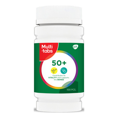 Multi-Tabs 50+ er et daglig kosttilskudd med 12 vitaminer og 8 mineraler. Det er utviklet for voksne over 50 år. Produktet inneholder kalsium og vitamin D. Kalsium og vitamin D bidrar til å opprettholde et normalt skjelett. Tilskuddet inneholder også vitamin C, B6, B12, D, jern og sink. Disse næringsstoffene bidrar til immunsystemets normale funksjon.
