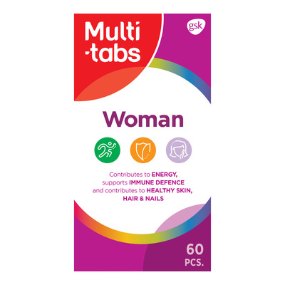 Multi-Tabs Woman er et daglig kosttilskudd for kvinner. Produktet inneholder vitamin B6, B12 og C. Disse vitaminene bidrar til et normalt energimetabolisme og reduserer tretthet og utmattelse. Det inneholder også vitamin D og C. Vitamin D og C bidrar til immunsystemets normale funksjon.
