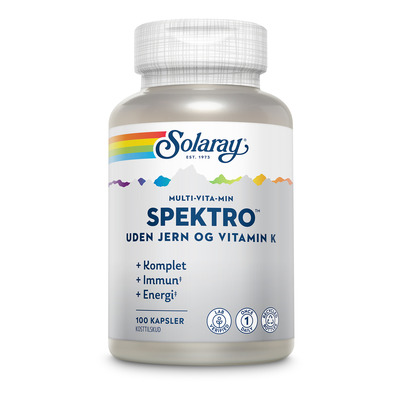 Solaray Spektro Multi-Vita-Min uten jern og K er et multivitamin- og mineraltilskudd som inneholder over 100 viktige næringsstoffer i 1 kapsel. Spektro er spesielt utviklet for å dekke kroppens daglige behov for både vitaminer og mineraler, lettopptakelig organisk kalsium, magnesium og 72 sporstoffer.