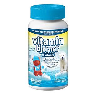 Vitaminbjørner D-vitamin med smak av jordbær er et tilskudd av D-vitamin for hele familien. Én vitaminbjørn inneholder 10 mikrogram D-vitamin og dekker dagsbehovet for barn og voksne. For voksne over 75 år anbefales 20 mikrogram. D-vitamin er viktig for å opprettholde et velfungerende immunforsvar, styrke skjelettet og tenner samt opprettholde en normal muskelfunksjon.