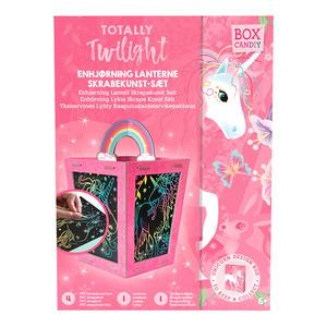 BOX CANDIY Scratch Art Lantern - Totally Twilight Unicorns er en kreativ måte å bringe lys og farge inn i ethvert rom. Med dette settet kan du lage en vakker lykt med et fascinerende enhjørningstema. Bruk skrapeteknikken for å få frem regnbuefargene på sidene av lykten, og se hvordan den ferdige lykten gir en glitrende glød til natten.