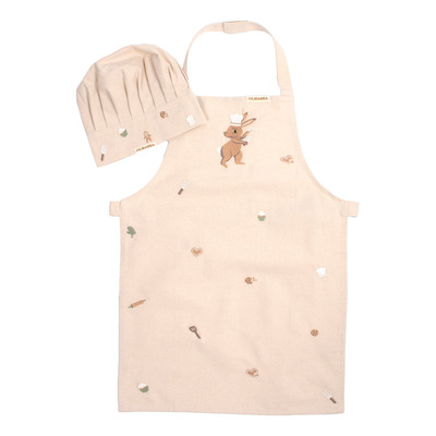 Filibabba Forkle og Kokkhatt med broderi GOTS - Wonderful Winter - Hare er utsmykket med delikate broderte bakemotiver og detaljer som en søt liten hare. Det gir et lekent og stilig uttrykk og gjør settet egnet til både lek og ekte bakeprosjekter. Perfekt som gave til kreative barn.