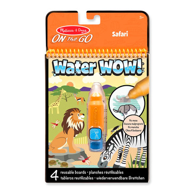 Med Melissa and Doug Water Wow Safari kan barna fargelegge uten maling og uten å søle. Boken inneholder fire gjenbrukbare sider med safariscener som avslører farger og detaljer når de males med den medfølgende vannpennen. Når sidene tørker, forsvinner fargene igjen, slik at barna kan male dem på nytt.