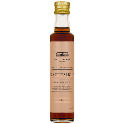 DE 5 GAARDE Kaffesirup Pumpkin Spice er en sirup med en varm og krydret smak inspirert av høstkrydderet kanel, ingefær og muskatnøtt. Den passer godt til varme kaffedrikker og iskaffe, og egner seg spesielt godt i perioden fra sensommeren til vinteren. Sirupen er produsert i Danmark av De 5 Gaarde.