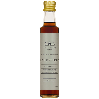 DE 5 GAARDE Coffee Syrup Salted Caramel er en sirup med en søt karamellsmak balansert med et lett saltinnhold. Den er laget av utvalgte råvarer og egner seg til varme og kalde kaffedrikker, iskaffe, desserter og bakevarer. Sirupen produseres i Danmark av De 5 Gaarde, som har hatt smak i sentrum siden 2002.