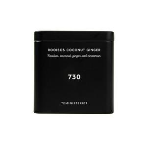 Teministeriets 730 Rooibos Coconut Ginger er en deilig te med en flott, rubinrød farge. Den er basert på rooibos, ingefær, kokos, eple og mandel krydret med kanel, kardemomme og sort pepper. Ekstra lang trekketid, sammenlignet med andre teer i serien, gir en ekstra god og intens smaksopplevelse.