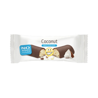 Easis Coconut Marzipan Bar: Kokos- og marsipanbar, overtrukket med 30 % melkesjokolade. Minimum 40 % kakaotørrstoff i sjokoladen. Inneholder søtningsmidler.
