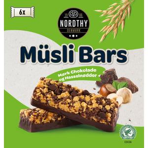 Disse lekre müslibarene fra Nordthy er laget av hasselnøtter og mørk sjokolade. De har en deilig smak som du kan nyte i et lekkert mellommåltid i løpet av dagen. Müslibarene er pakket individuelt så det er enkelt å ta dem med i vesken til når sulten melder seg.