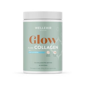 Wellexir Glow Pure Collagen blandes i et glass kaldt vann og er en enkel måte å få i seg kollagen på. Dette kollagenpulveret er laget av 100 % hydrolyserte kollagenpeptider fra storfe. Pulveret er smaksnøytralt, så du kan ikke smake pulveret. Kollagenpulveret er gluten-, melke- og laktosefritt og er ikke tilsatt sukker.