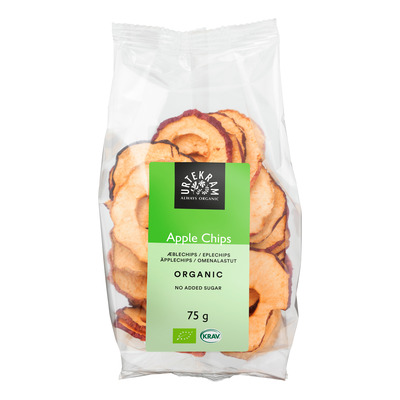Urtekram Økologiske tørkede eplechips er smakfulle, sprø epleringer som er naturens svar på chips. De har en behagelig sødme og et høyt innhold av kostfiber. Et ideelt mellommåltid for både barn og voksne som ønsker et naturlig alternativ til godteri.