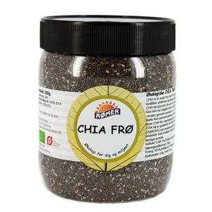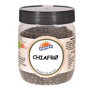 Økologiske chiafrø fra Rømer. Frøets størrelse kan sammenlignes med et sesamfrø. Omega-3-fettsyreinnholdet er imidlertid betydelig høyere i et chiafrø. Frøet er en av de beste kildene til omega-3 i planteriket. Omega-3-innholdet i laks tilsvarer bare 2 spiseskjeer chiafrø!