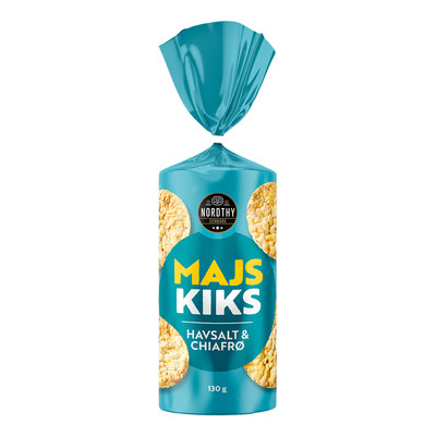 Nordthy Maiskjeks Havsalt & Chiafrø er sprø maiskjeks med chiafrø og en enkel smak av havsalt